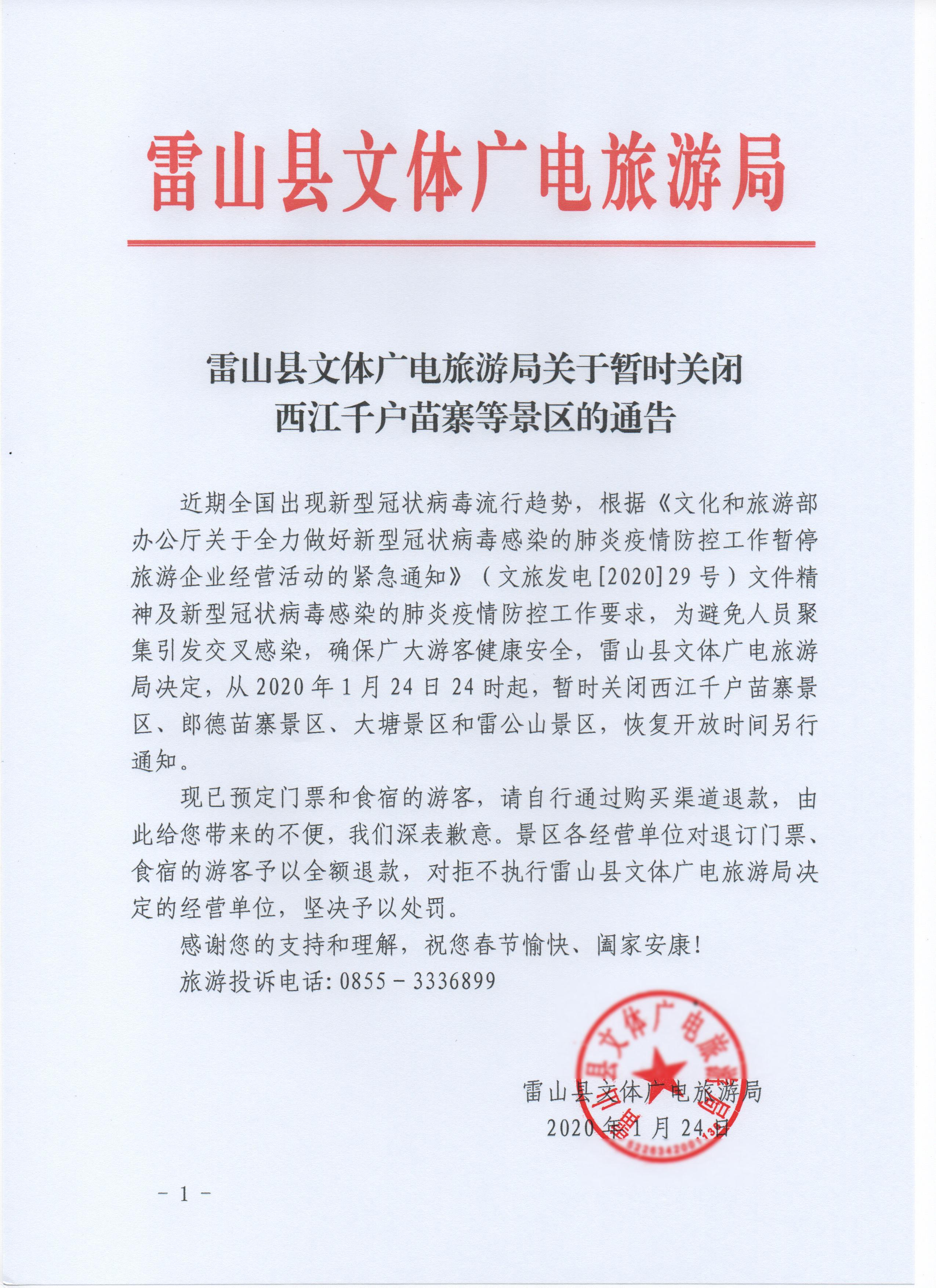 近期全国出现新型冠状病毒流行趋势,根据《文化和旅游部办公厅关于全力做好新型冠状病毒感染的肺炎疫情防控工作暂停旅游企业经营活动的紧急通知》(文旅发电[2020]29号)文件精神及新型冠状病毒感染的肺炎疫情防控工作要求,为避免人员聚集引发交叉感染,确保广大游客健康安全,雷山县文体广电旅游局决定,从2020年1月24日24时起,暂时关闭西江千户苗寨景区、郎德苗寨景区、大塘景区和雷公山景区,恢复开放时间另行通知。
