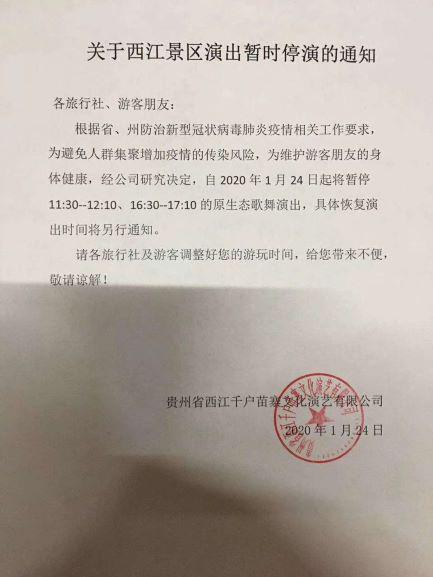 各位旅行社、游客朋友: 根据省、州防治新型冠状病毒肺炎疫情的相关要求,为避免人群聚集增加的传染风险,确保游客朋友的自身安全健康,经公司研究决定,在春节期间暂停景区一切文化展示展演互动,具体恢复文化展演活动另行通知