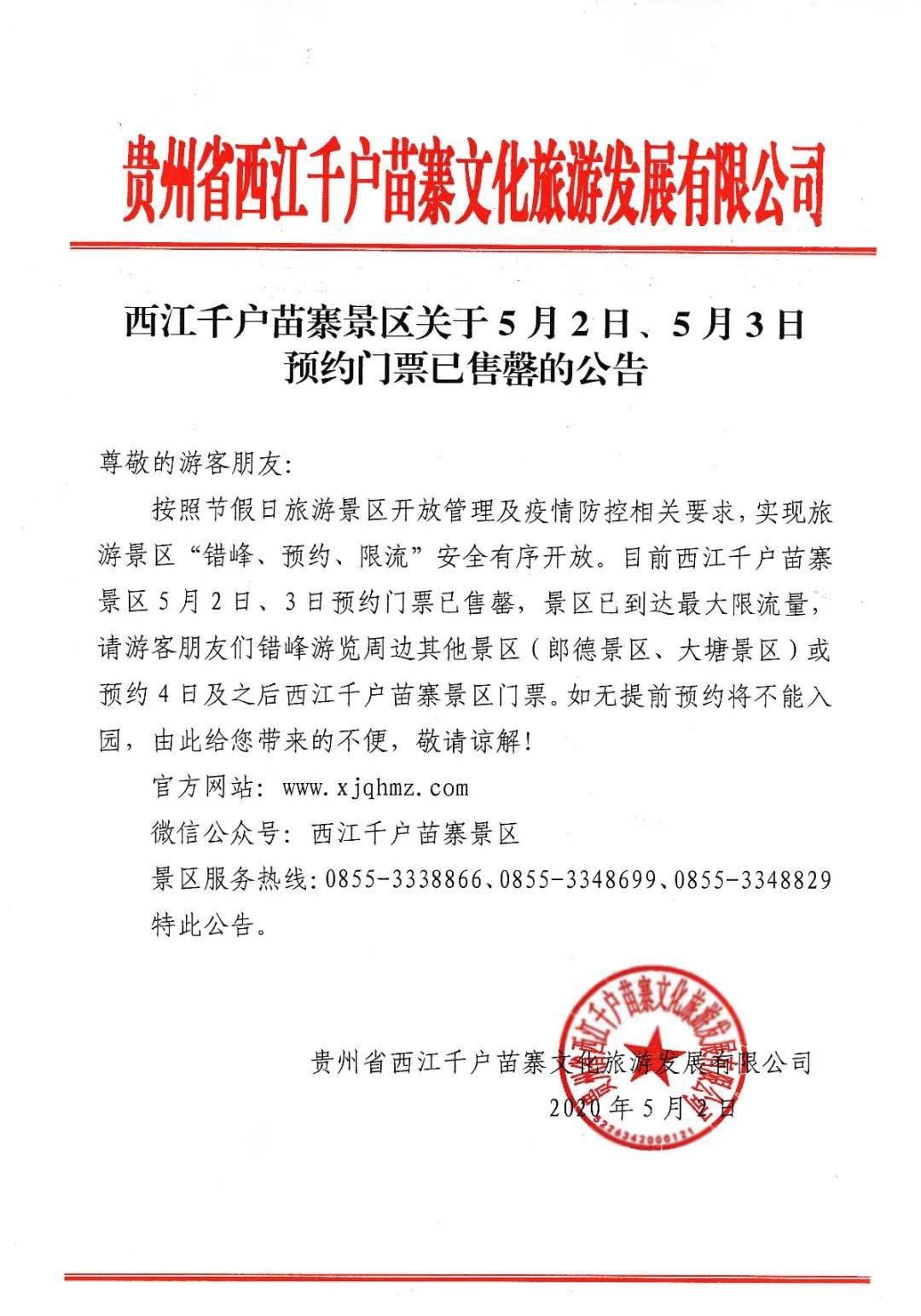您好!按照节假日旅游景区开放管理及疫情防控相关要求,实现旅游景区“错峰、预约、限流”安全有序开放。目前西江千户苗寨景区5月2日、5月3日预约门票已售罄,景区已到达最大限流量,请游客朋友们错峰游览周边其他景区(郎德景区、大塘景区)或预约4日及之后西江千户苗寨景区门票。如无提前预约将不能入园,由此给您带来的不便,敬请谅解!