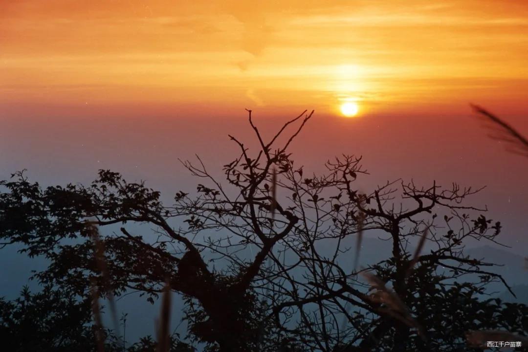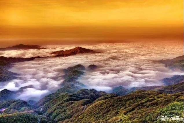 夕阳西下,落日的余辉将整个云海染渲染成金灿灿的黄色,闪闪发光。一座座连绵起伏的山峰伏矗立在云海之间似蓬莱仙境。云海似大海之滨,波涛澎湃,如水击石,上下翻滚。红日、墨山、云海构成了一幅多姿多彩的画卷,美好时光在此刻静止。