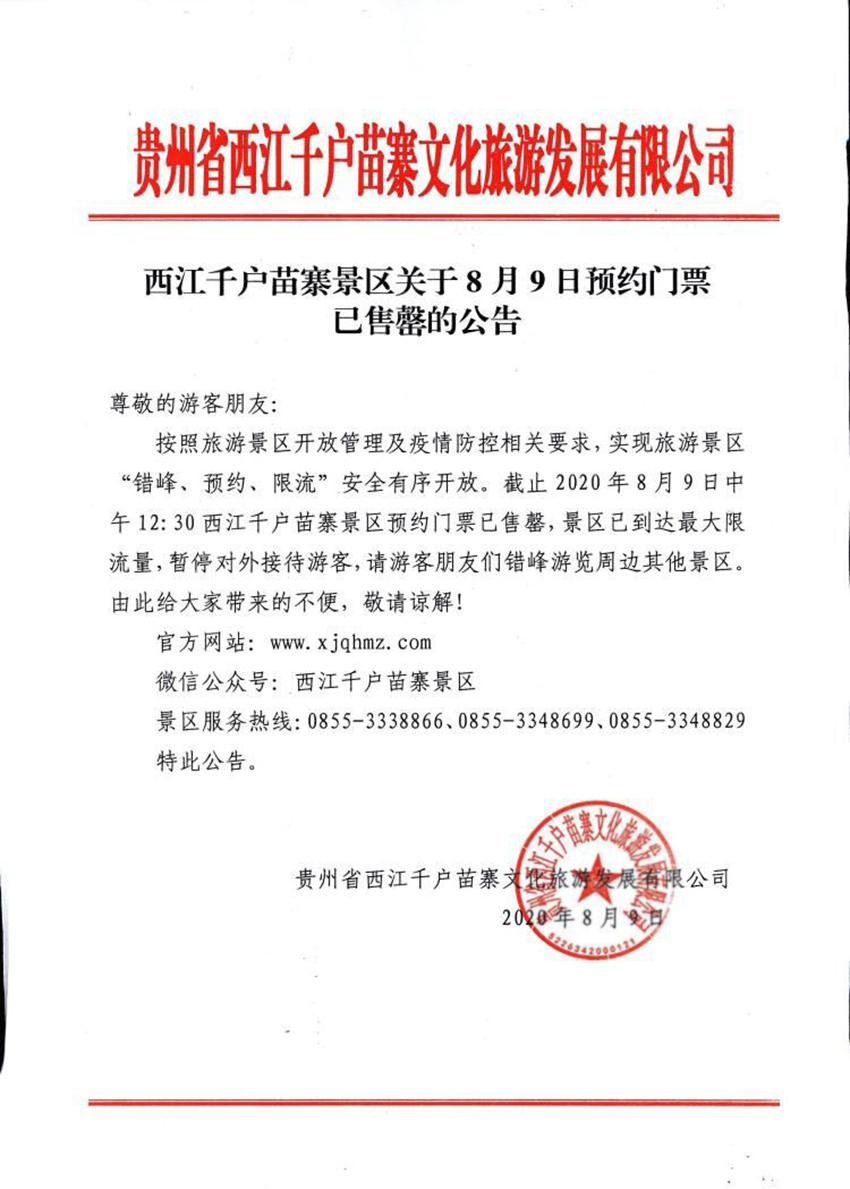 西江千户苗寨景区关于8月9日预约门票已售罄的公告