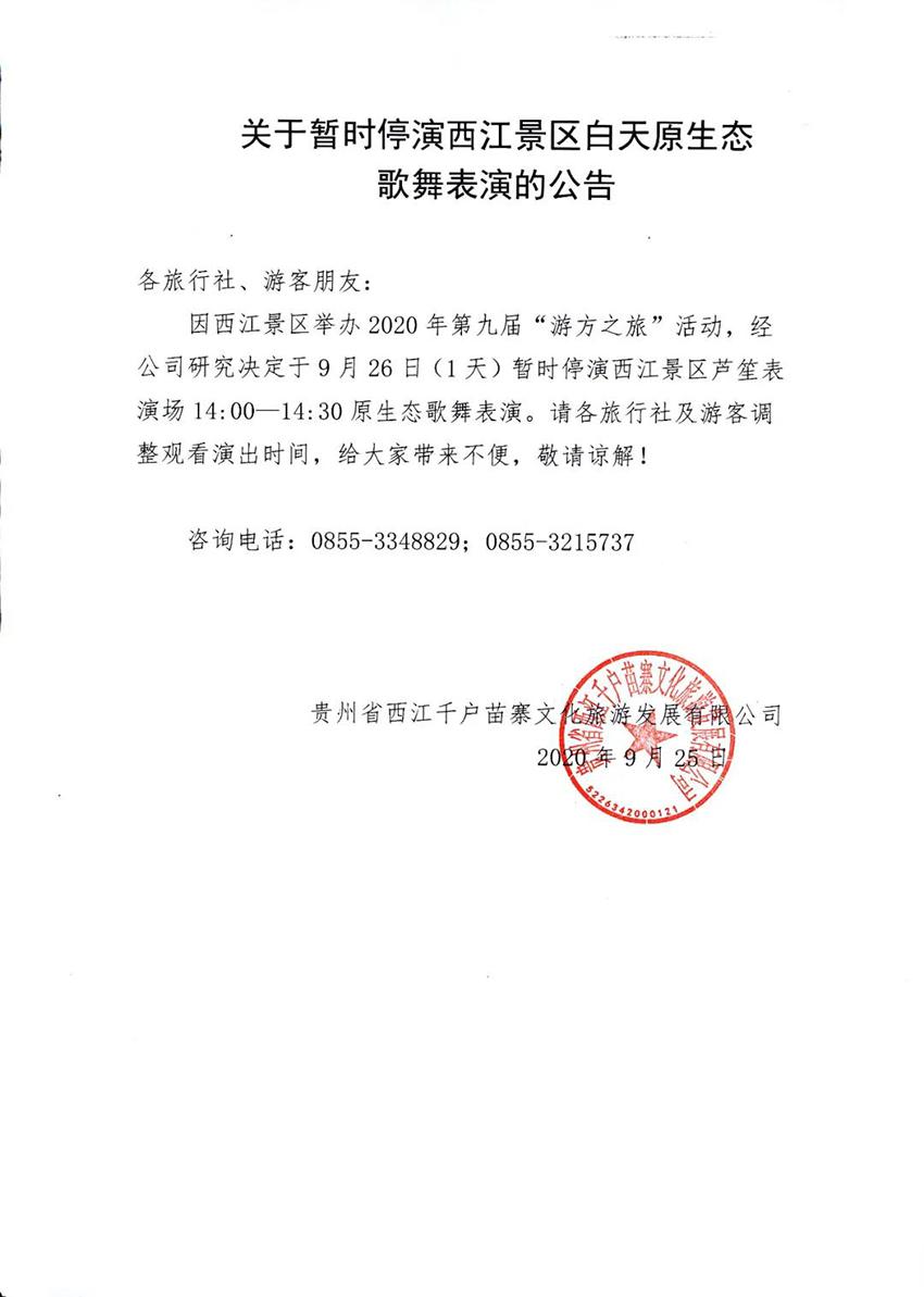 因西江景区举办2020年第九届“游方之旅”活动,经公司研究决定于9月26日(1天)暂时停演西江景区芦笙表演场14:00—14:30原生态歌舞表演。请各旅行社及游客调整观看演出时间,给大家带来不便,敬请谅解!