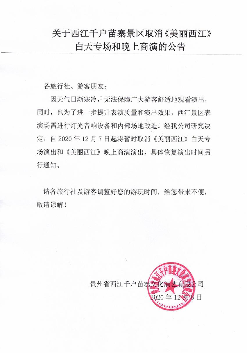 关于西江千户苗寨景区取消《美丽西江》白天专场和晚上商演的公告