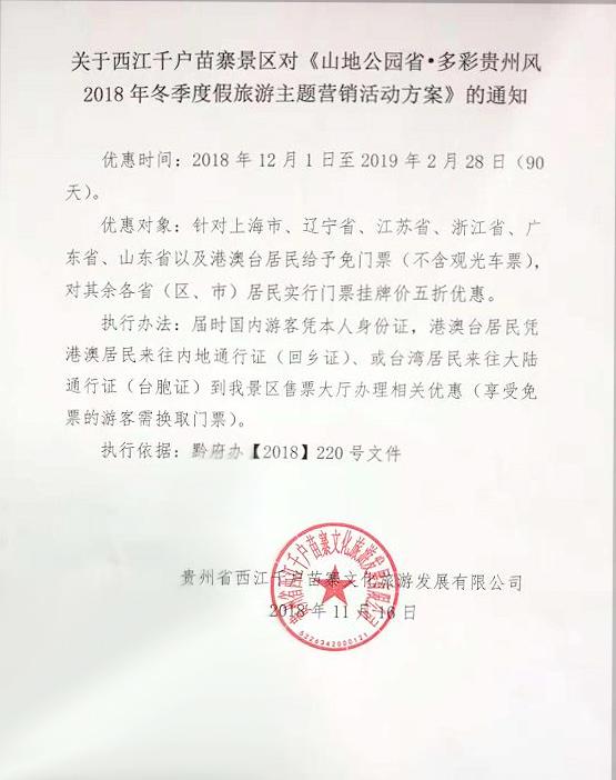 关于西江千户苗寨景区对《山地公园省•多彩贵州风2018年冬季度假旅游主题营销活动》的通知