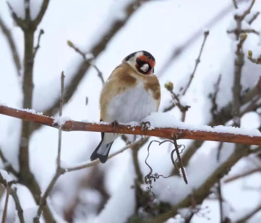 穿过枫林,小鸟儿在天空与雪花共舞。