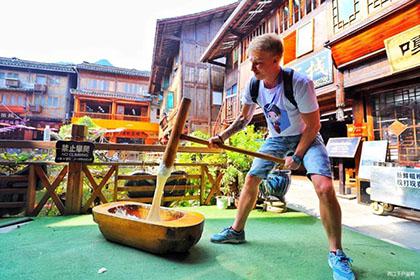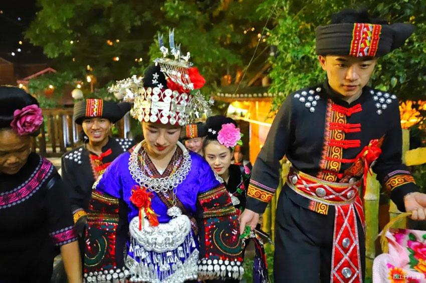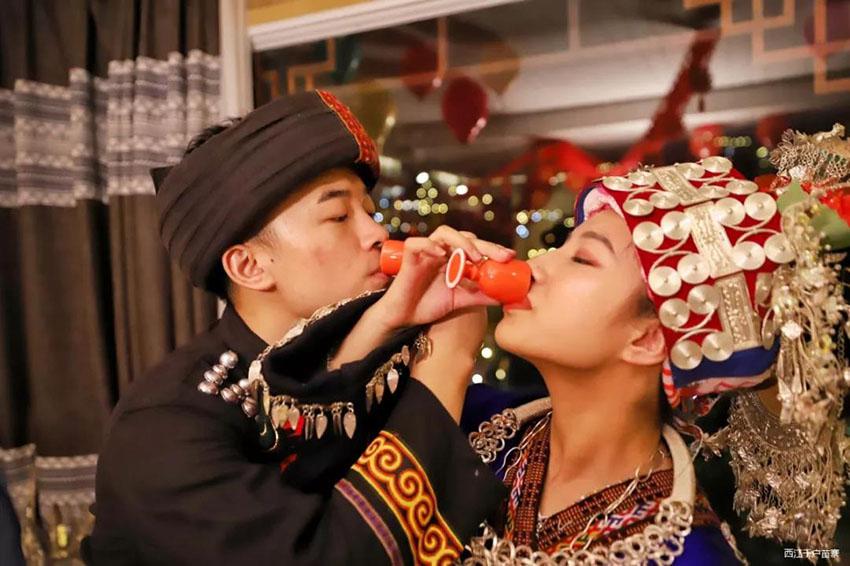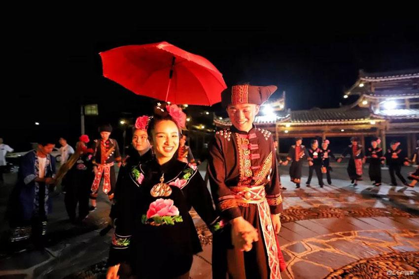 游方之旅中,嘉宾们除了亲手制作蜡染作品、体验苗家打糍粑、跟随银器师傅学习银器打造之外,还一同前往郎德苗寨,在朗德上寨风雨桥体验了游方对歌和十二道拦门酒。在郎德不仅欣赏到了美景,还亲身参与体验了苗族的“偷亲”。在迎亲队伍猛灌拦门酒的掩护下,新郎如愿以偿地把新娘从郎德“偷”到了西江。8日上午,伴郎伴娘和新人同村民们一起上街进行苗族婚俗巡游,在西江千户苗寨的大街向在场游客派发喜糖,场面十分热闹。