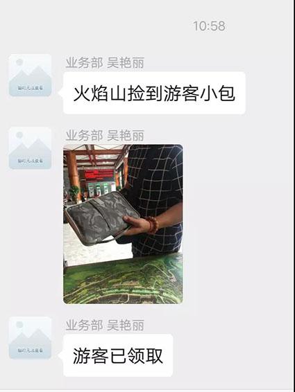 10月5日,景区工作人员吴艳丽在售票大厅拾到游客王先生的黑色手提包一个,里面存有大量现金和证件,于是该同志赶紧将拾到手提包的信息发到景区工作群寻求大家帮忙共寻失主,最终在全体员工的共同努力下,终于联系到失主,并将手提包及时归还。失主非常感动,并深表谢意。