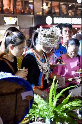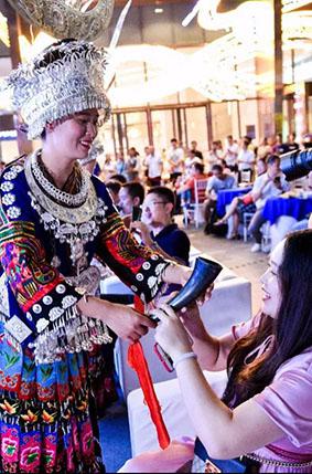 推介会现场,还专门设置了苗族美食体验区,让现场的嘉宾足不出户,在家门口就能品尝苗寨的饕餮美味!酸汤鱼、苗家米酒、黄米糍粑、五彩糯米饭等美食让现场的嘉宾大饱口福!美食区的布置也充满了浓郁的西江苗寨风情,热情好客的苗寨阿哥阿妹们邀请现场观众体验了苗族特有的“高山流水”,引得不少男嘉宾跃跃欲试,一大碗酒下肚,每个人都似乎都对这碗苗家美酒回味无穷。加上来自苗寨朋友热情的歌舞表演。苗族敬酒、苗族舞蹈、苗族歌曲、苗族乐器表演等全方位的展示西江千户苗寨特有的文化和艺术。正当大家还意犹未尽时,一部展示西江千户苗寨的宣传片,带我们领略了美丽的苗寨和神秘的郎德。通过宣传片,现场的许多人都看得心潮澎湃,仿佛想立即跳进视频里在那如画的风景里畅游一番。