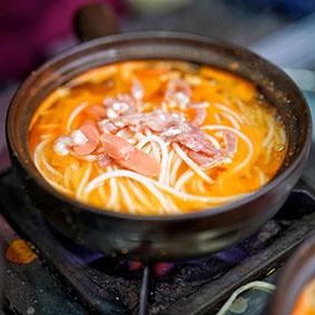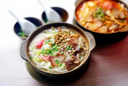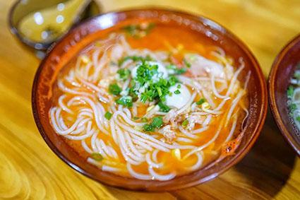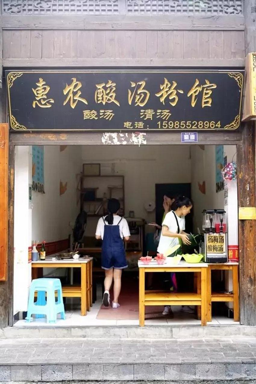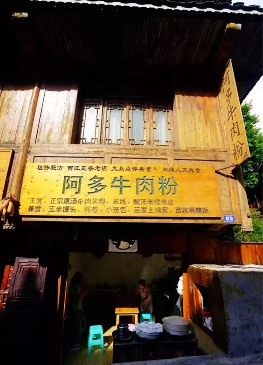 这家店已经开了8年了,也算的上是西江千户苗寨里的老店了。她家的辣椒是自家制的,吃粉前先喝一口酸汤,汤底是骨头汤,再加上微微偏辣的酸汤,刺激你的味觉,配上腊肉手工米皮或是米粉,肉沫、香肠、鹌鹑蛋,满满的一碗,是清晨的幸福。