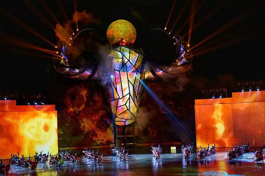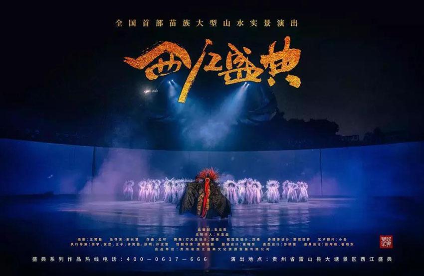 【西江盛典】依托大塘景区原始苗寨风貌和周边的自然景观,通过全息山体投影、灯光、舞美、造型、实景布景等与舞蹈的编创设计融合,配合可容纳2520名观众的360度可旋转风雨桥观众看台,全景再现了苗族儿女在祖先蚩尤带领下的迁徙史、发展史以及苗族人民智慧文明的伟大结晶,呈现出了一部气势磅礴的苗族文化盛宴,展现了苗族人民用智慧勇敢,守护家园的精神风貌。