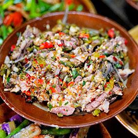 【苗王鱼】是西江出了名的苗族特色菜,在这里也能吃到,将鱼肉蒸熟后捣碎再拌配上剁碎的青椒,红椒和蒜末,一入口鱼肉的鲜味,辣椒的辣味层层递进,口感丰富。另外还有【咕咾肉】【白斩鸡】【苗家腊味】以及苗家家常菜这里都能吃到。