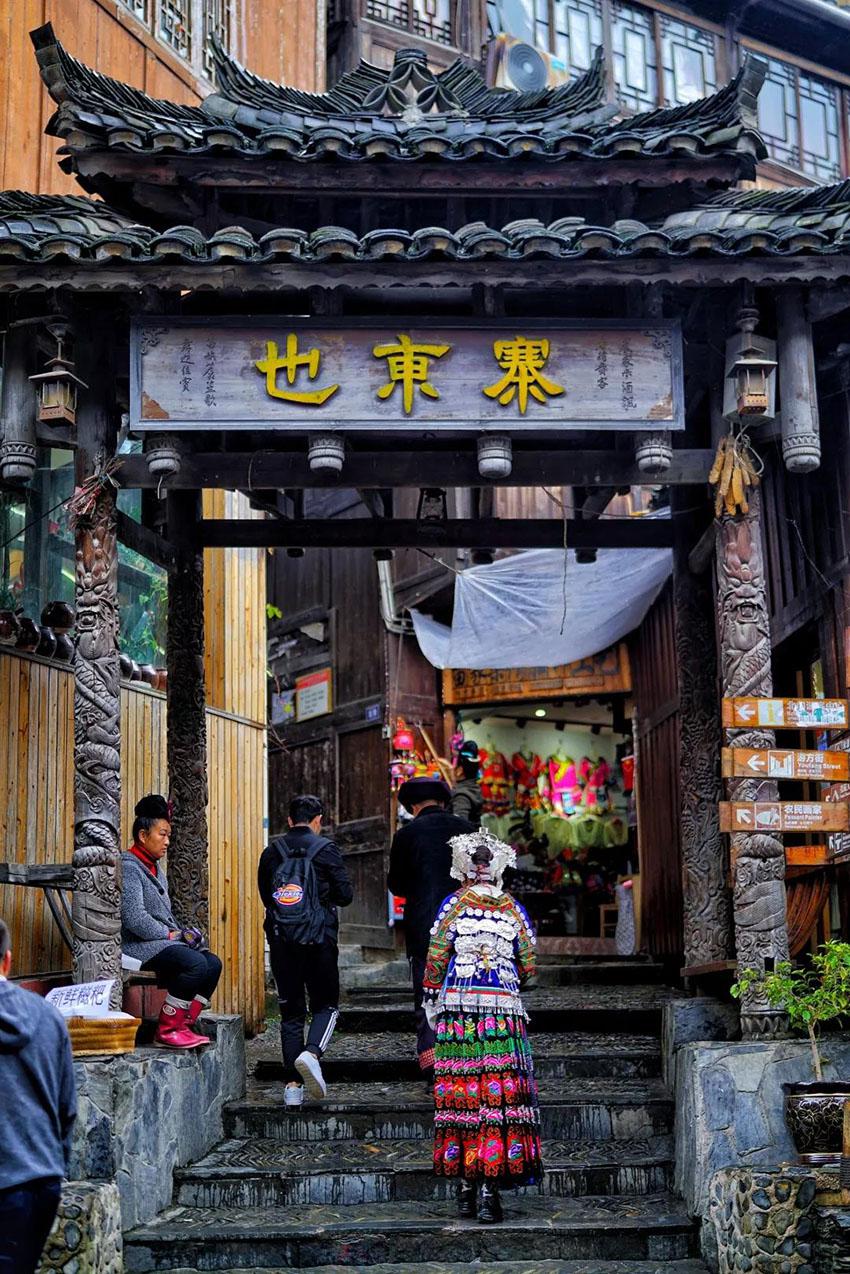 沿着苗寨石阶往上攀爬,空气爽朗,一路上随处可见的苗家木吊脚楼建筑是这座苗寨藏不住的底蕴和不经意的傲娇,放慢步伐,细细欣赏它的美。