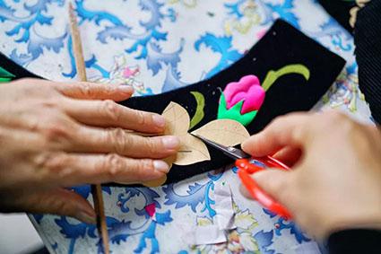 一进屋就能看见刺绣坊的墙上挂满了刺绣,有大有小,年代有近有远,都是一针一线绣出来的。而且有的绣片甚至已经经历了三百多年,传承了好几代人,平绣、绉绣、辫绣、破线秀、盘绣…..都有,简单的小绣品至少要1-2天完成,大的绣品甚至要花上几个月时间,一件成衣也至少需要半年才能完成。