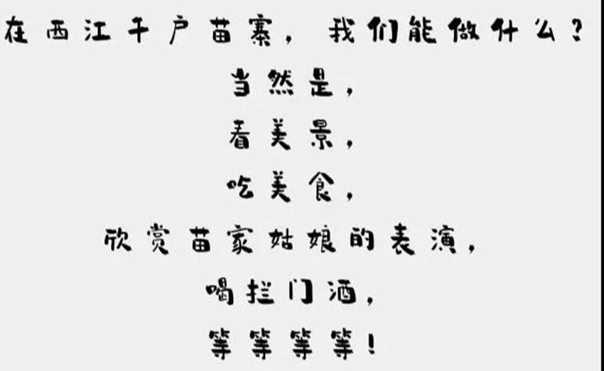 当你来到西江千户苗寨景区的北门,就会看见苗寨人穿着盛装,摆着十二张大方桌,苗家姑娘端上米酒,同时请来村寨德高望重的寨老来敬酒,这是苗家迎接宾客的最高礼——十二道拦门酒。这十二道酒分别代表了十二道祝福与祈愿:一道恭喜; 一道昌盛;三道勤劳;四道善良;五道宽宏;六道富裕;七道明亮;八道美丽;九道长寿;十道英雄;十一道智慧;十二道华贵。