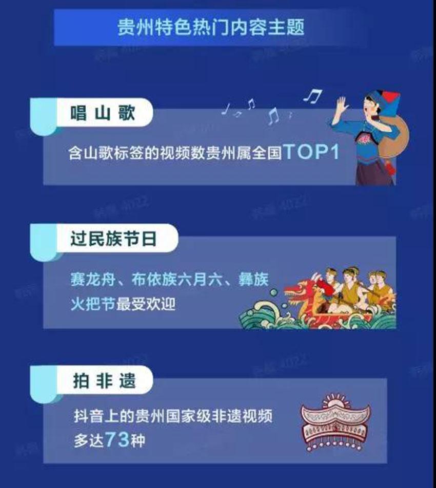 过去人们对贵州的刻板印象是“天无三日晴,地无三尺平,人无三分银”,但抖音贵州旅游大数据却呈现了一个多彩纷呈的城市形象。报告显示,因独特地貌和民族文化,“风景”是贵州旅游搜索热词,唱山歌、过民族节日、拍非遗则成为抖音上贵州的三大特色热门内容主题,用短视频记录下来的贵州国家级非遗多达73种。