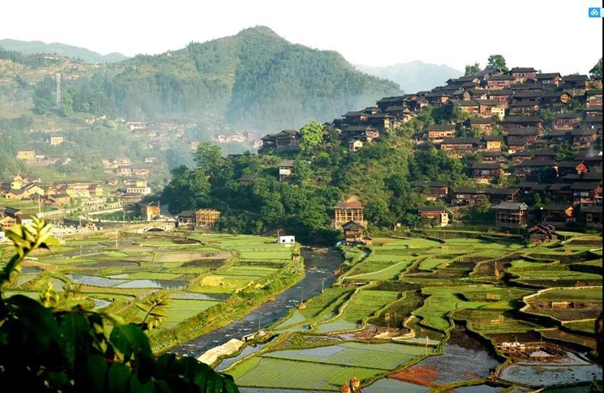 西江千户苗寨位于贵州省黔东南苗族侗族自治州雷山县东北部的雷公山北麓,西江苗寨四面环山,重峦叠嶂,梯田依山顺势直连云天,白水河穿寨而过,将西江苗寨一分为二。