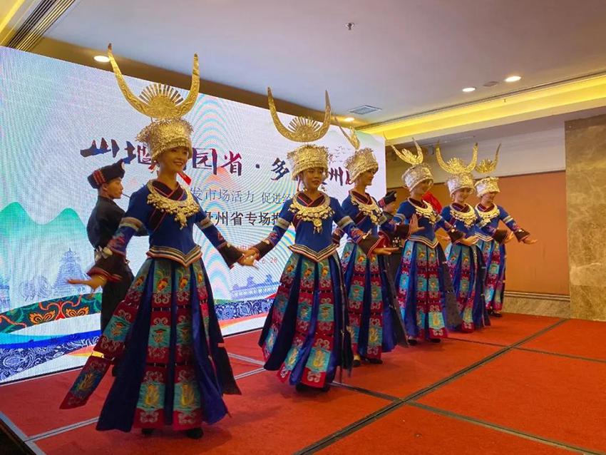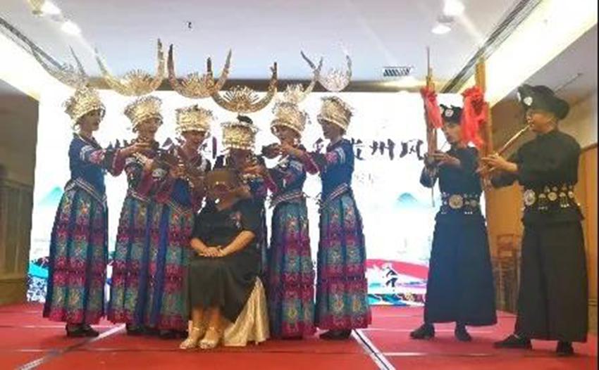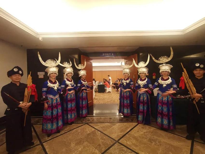 当日下午,在贵州专场推介会活动中,贵州黔东南州、赤水市、六盘水市文旅局领导纷纷上台推介贵州旅游资源,来自西江苗寨的阿哥阿妹们向参会嘉宾奉献了精彩的苗族歌舞节目,去呗旅行社有限公司董事长黄郑珠女士受邀参加了“高山流水”敬酒礼,现场气氛推至最高潮!