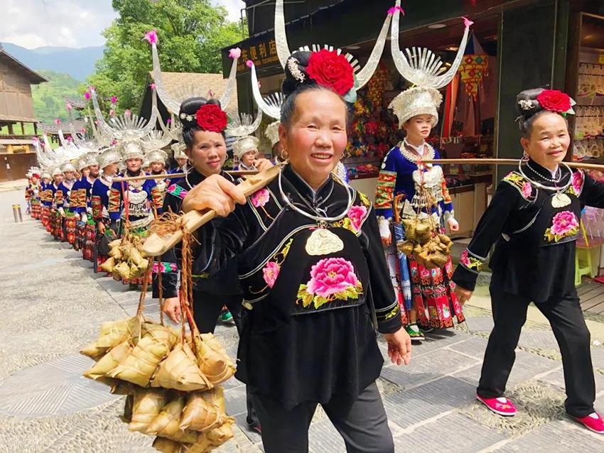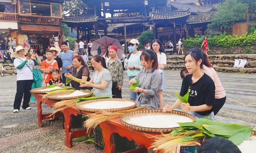 景区通过举办具有端午特色的主题活动,营造出浓厚的节日氛围,吸引各方游客。“端午挑粽巡游”、“包粽擂台赛”等不仅为游客赠送香粽、老鼠公仔和美好祝愿,还让他们体验到了浓厚的端午节文化氛围,此外,苗寨的嘎歌古巷内的刺绣、蜡染等非遗文化体验项目也广受游客们的喜爱。