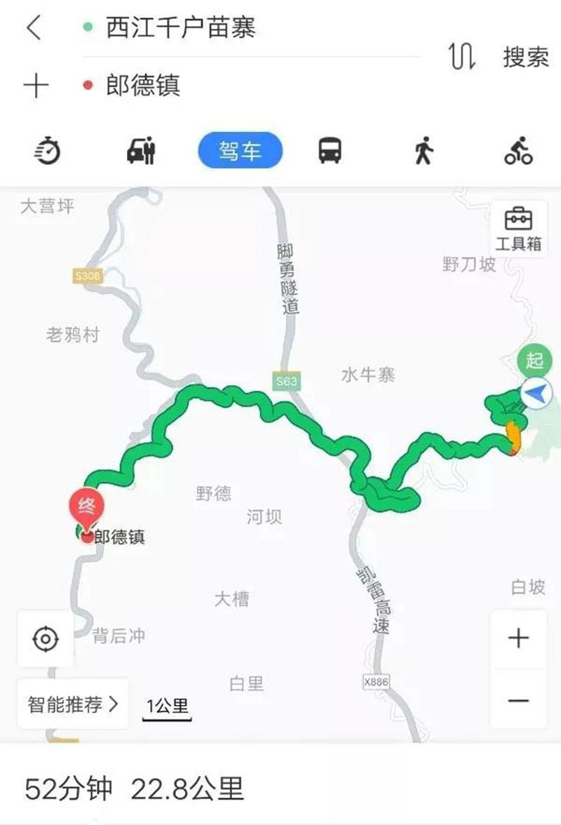西江千户苗寨到郎德苗寨约50分钟车程,郎德苗寨是一个原始古朴的苗寨,依山傍水,四面被群山环抱,寨前有一条小河静静流过,是2008年奥运圣火走过的地方。百度地图搜索如下所示: