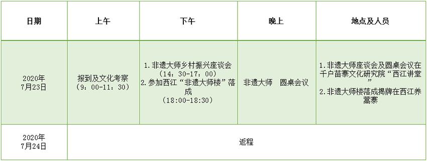 2、非遗大师座谈会。召开非遗大师座谈会,就非遗技艺传承传播与旅游融合情况,助推西江后疫情时代旅游转型与振兴,发表非遗大师的“西江倡议”。