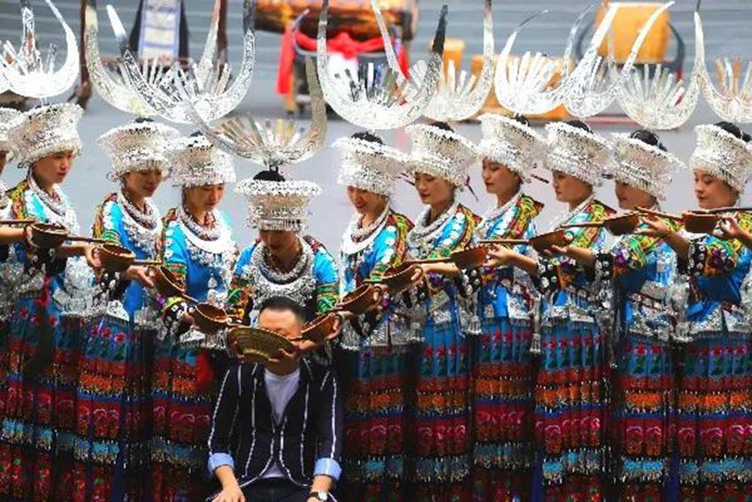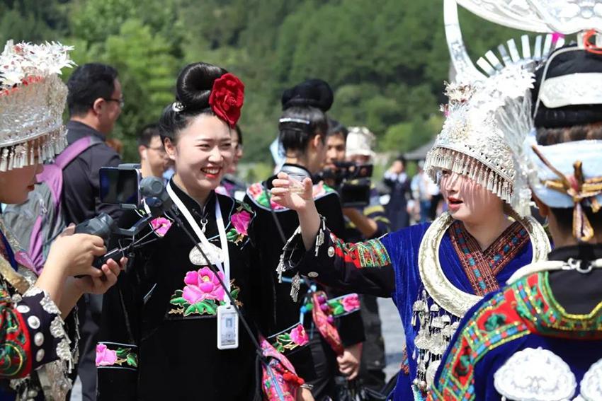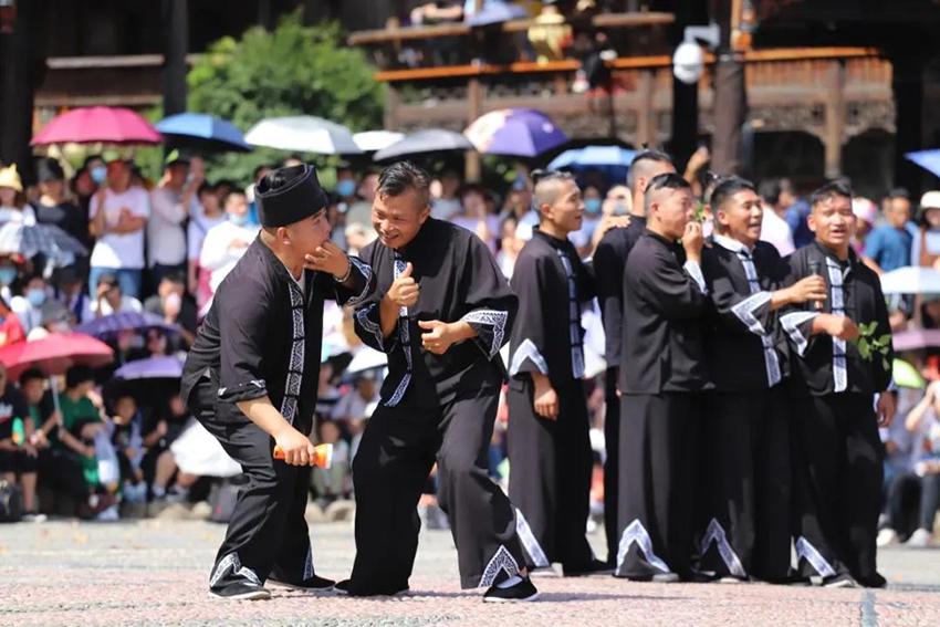 芦笙场上,游客们一起融入“苗族原生态大巡游”活动,载歌载舞,欢庆苗年。