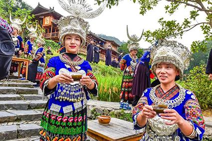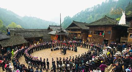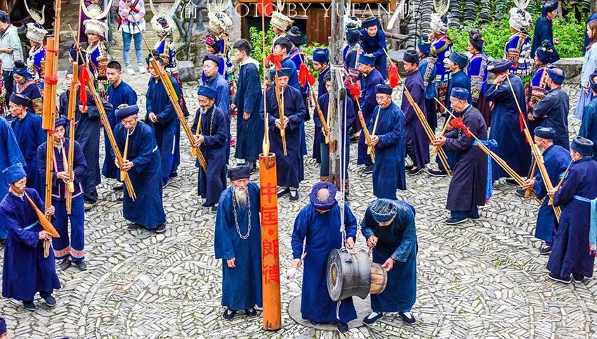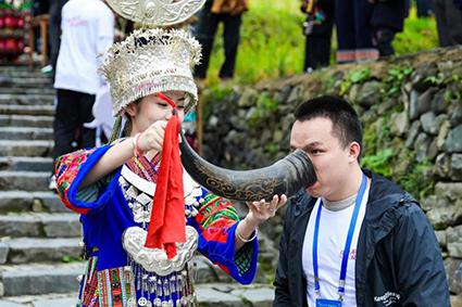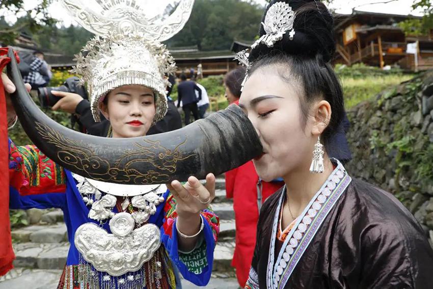 苗族最热情的苗族敬酒礼。“江山为主,人是客。”西江苗寨以山为友,以山为伴,大山给苗寨生存的一切,所以要像山一样对待每一位来客,为此用“高山流水”礼待客人,寓意热情像山一样高,友谊像水一样长。