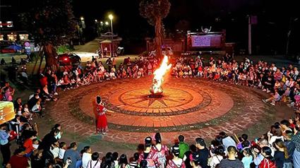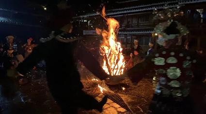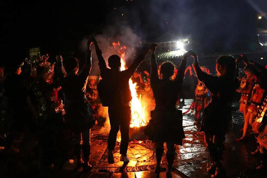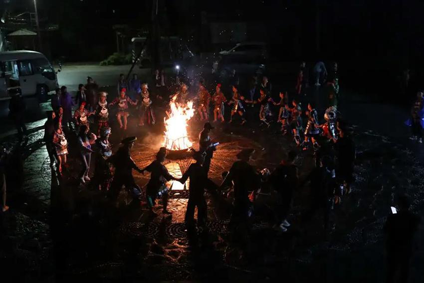 篝火晚会一般都是由年轻的阿哥阿妹来组织,村民们穿戴着自己的苗族服饰,以歌舞表演的形式进行。最后点燃篝火,吃完饭后苗家阿妹阿哥就会邀请客人一起围着篝火载歌载舞,现场热闹非凡。