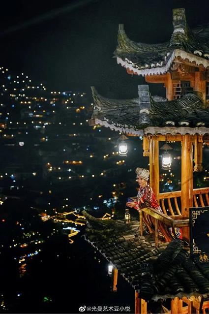 入夜,在山间吹着晚风,在这美丽的山水之间,俯瞰千户苗寨,观万家灯火,在这里,你发现,夜空下璀璨的,不只是星光,还有在千户苗寨古街里、吊脚楼上、人群中藏匿着的无数传说、温暖和感动。