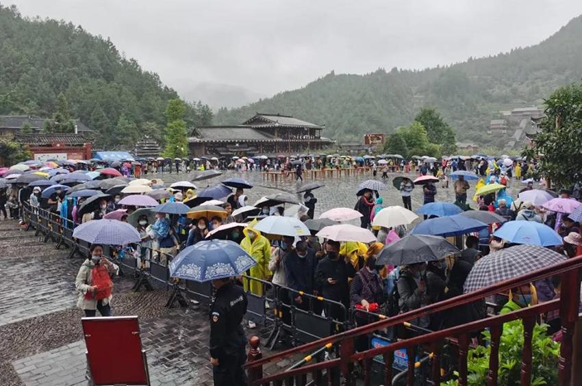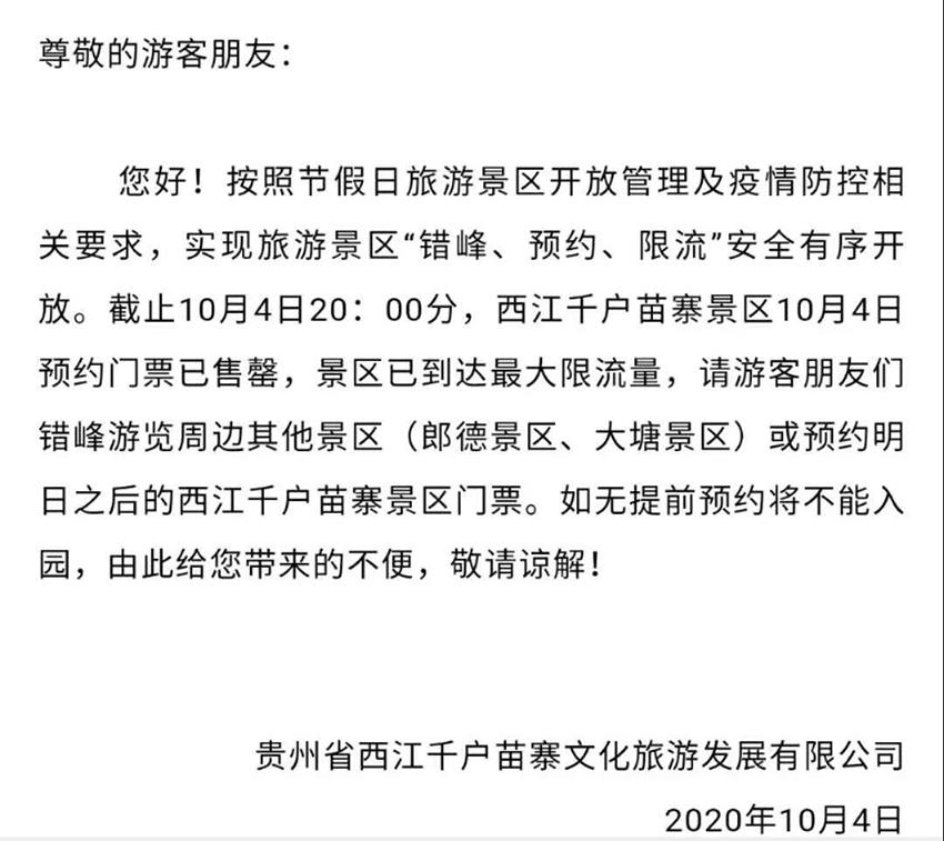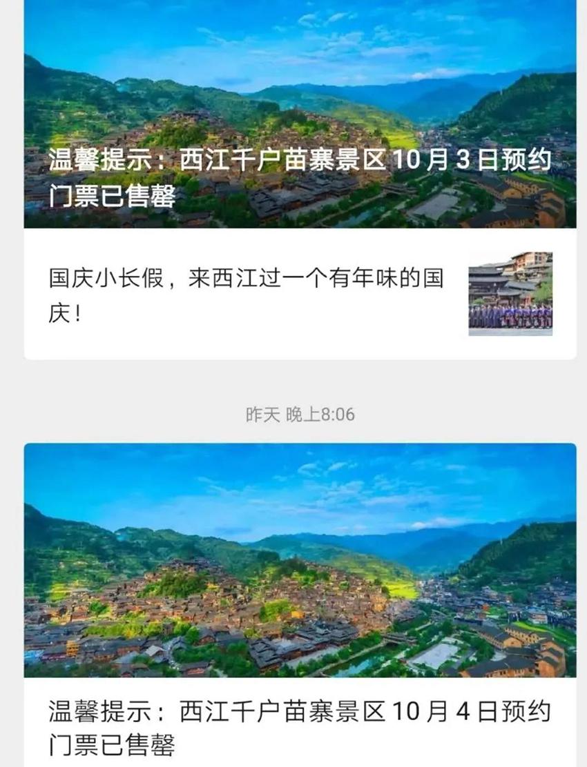 目前景区游客接待量大,根据国家文化和旅游办公厅下发通知,科学合理设置西江景区接待游客量不超过最大接待量的75%。景区实时接待量达到上限后,相关部门会及时发布门票售罄公告,以保游客及时调整旅游行程。