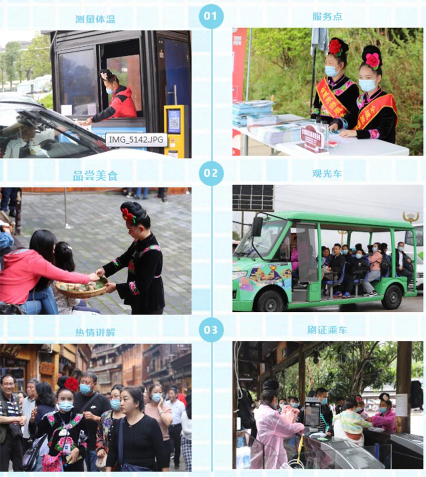 目前西江千户苗寨景区实行线上预约购票,刷身份证入园,加大网络售票的力度,开通微信支付,增设检票通道,方便游客在第一时间进入景区。加强运营调度管理,增加内部游览车至50辆,摆渡车42辆,以最快速、最安全的方式把游客顺利送达景点。景区在假日期间增设临时咨询处24个,进行引导服务,及时为游客办实事、解难事。景区咨询、投诉电话24小时开通,为游客提供各类游览咨询服务,解决假日游客投诉。