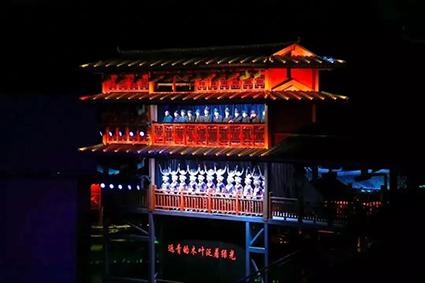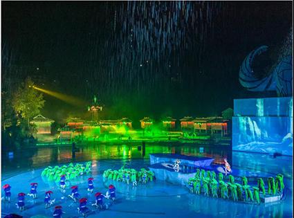 《西江盛典》位于贵州省黔东南雷山县大塘风景区,距离西江千户苗寨25.2公里。这部以苗族历史创作,以苗族5000年历史为背景,将苗族建筑、农耕、历史、民风民俗为元素,通过全息投影、灯光、舞美、造型、大型装置等实景布景,配合可容纳3000名观众的360度可旋转观众台以及大型升降舞台勾画出一幅传奇的苗族文化实景大剧。