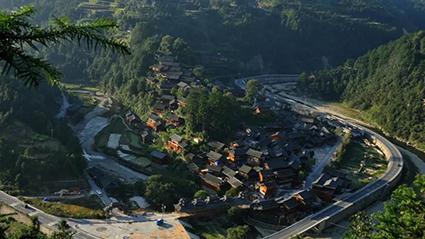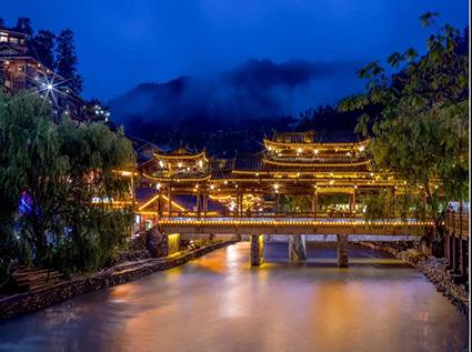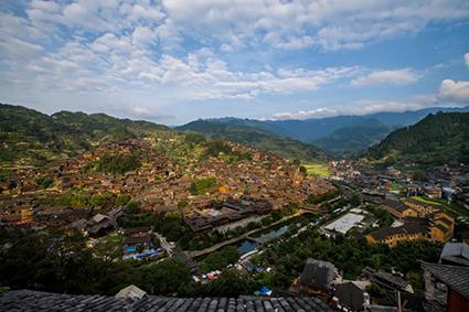 世界上最大的苗寨,中国历史上苗族五次大迁徙的最大聚居地,四面环山,重峦叠嶂。苗寨吊脚木楼依山而建,层层叠叠、连绵成片,白水河穿寨而过,将苗寨一分为二,形成背靠青山、脚踏玉带,建筑与山体相互依存,苗家人与自然和谐统一。