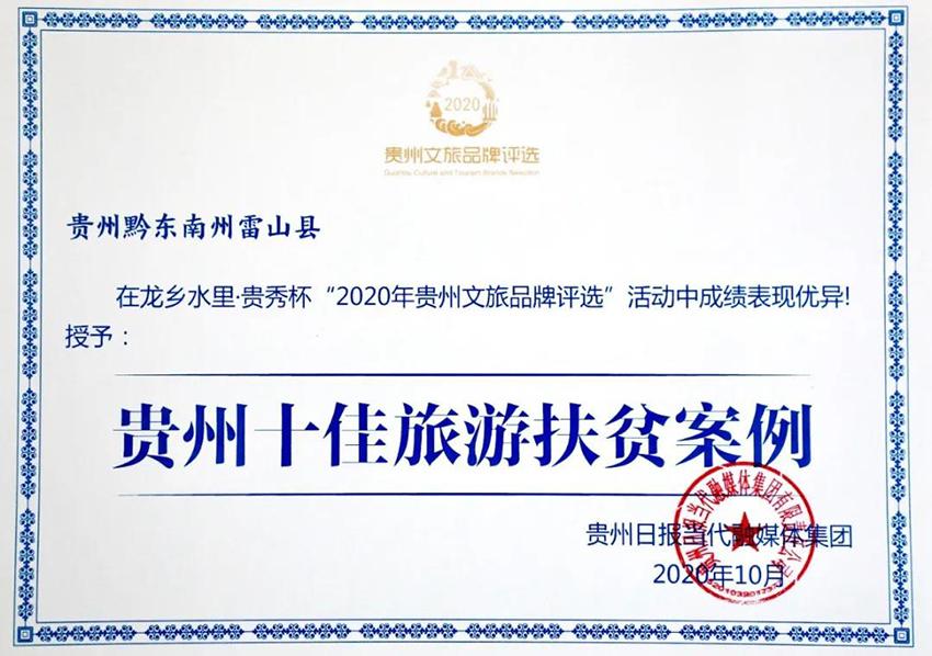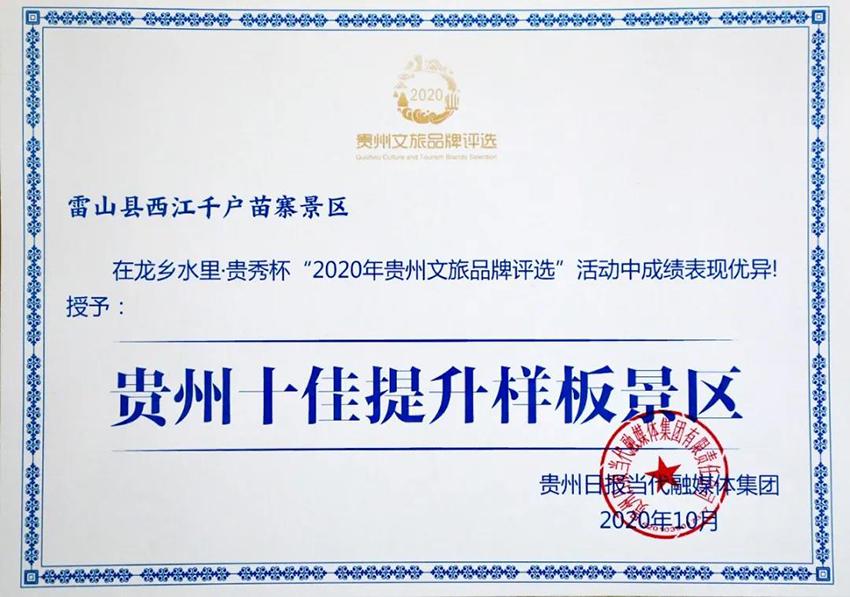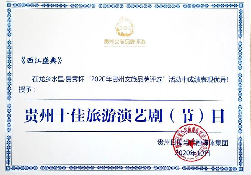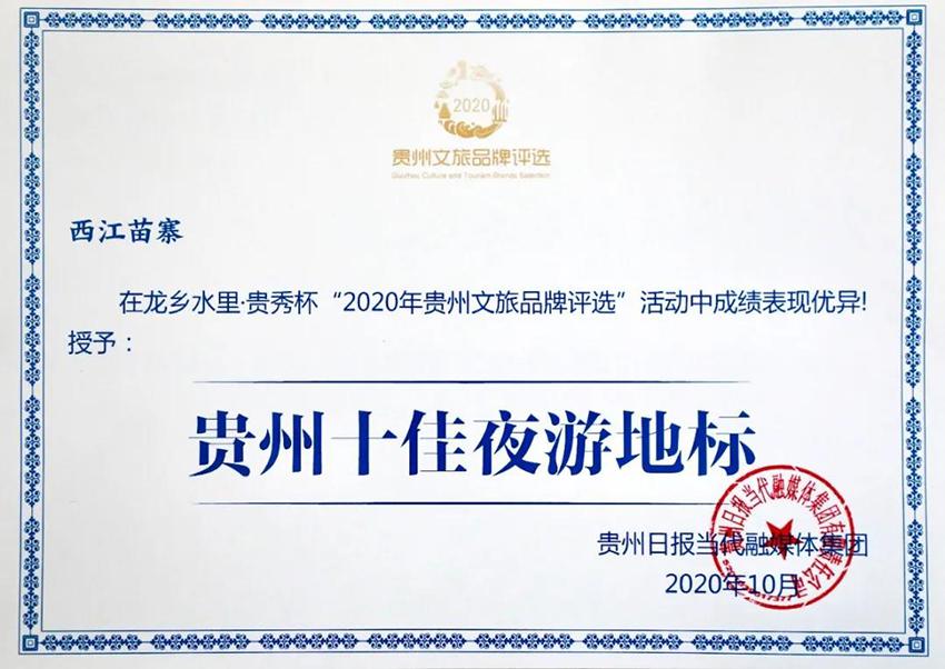 10月28日,贵州文旅行业年度盛宴——“龙乡水里·贵秀杯”2020贵州文旅品牌评选在贵州龙里水乡旅游生态城举行颁奖典礼。此次评选贵州省黔东南州雷山县荣获“贵州十佳旅游扶贫案例”,同时贵州省雷山县西江千户苗寨景区荣获“贵州十佳提升样板景区”、“贵州十佳夜游地标”,雷山县大塘景区《西江盛典》荣获“贵州十佳旅游演艺剧(节)目”。