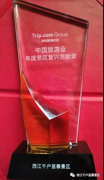 (图为西江千户苗寨荣获“中国旅游业年度景区复兴贡献奖”奖杯)