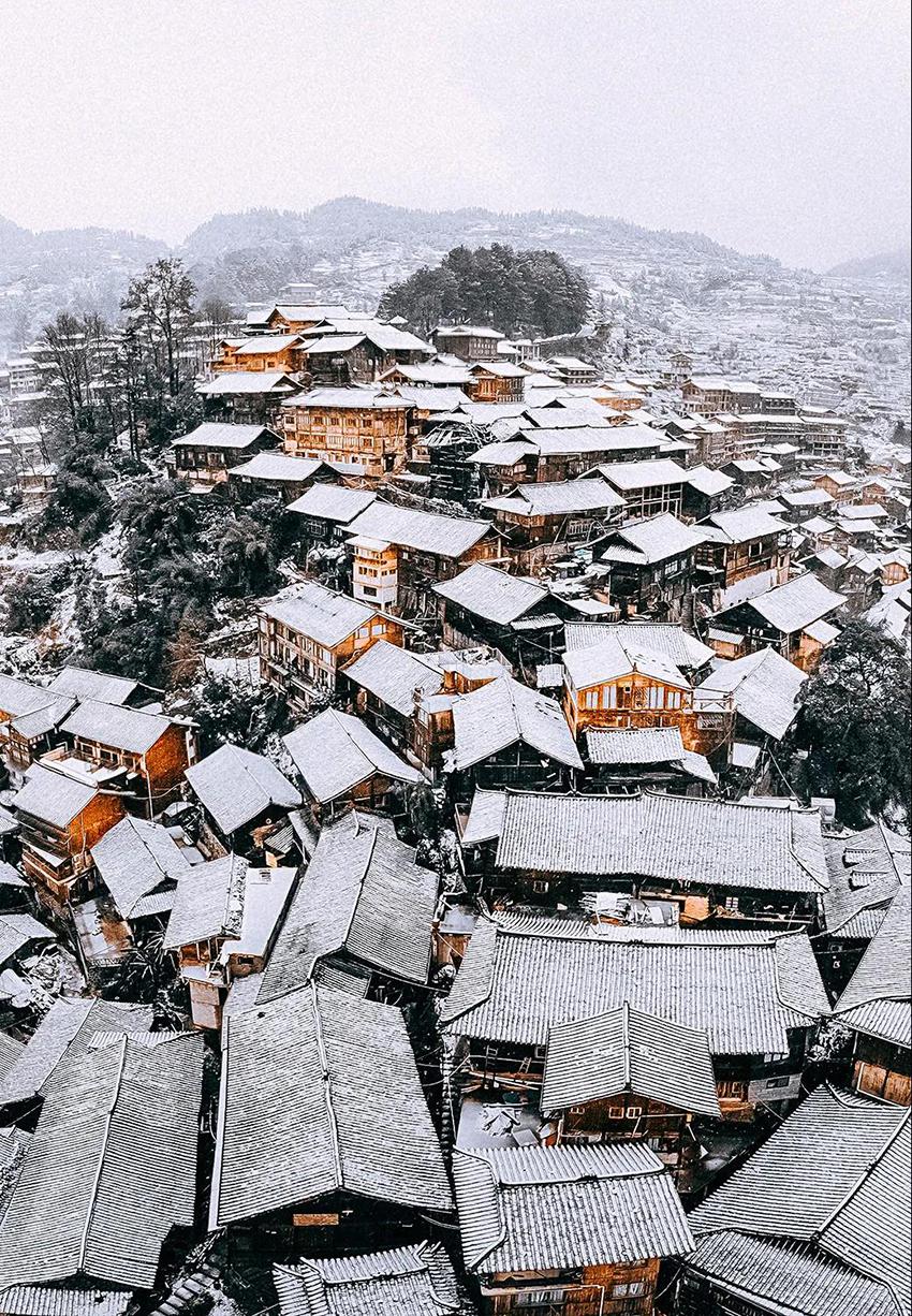 西江千户苗寨景区冬季雪景如诗如画,它没有浮夸的妆容,只身着一袭白衫,唯美简约。松树上缀满了怒放的白花,层峦叠嶂的吊脚楼布上了一层神秘的白纱,风雨桥伫立白水河畔之上与萦绕飘逸的晨雾相应 ,宛如人间仙境 ,美不胜收。您不期待吗?