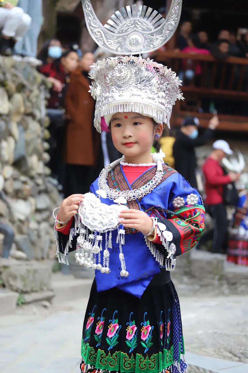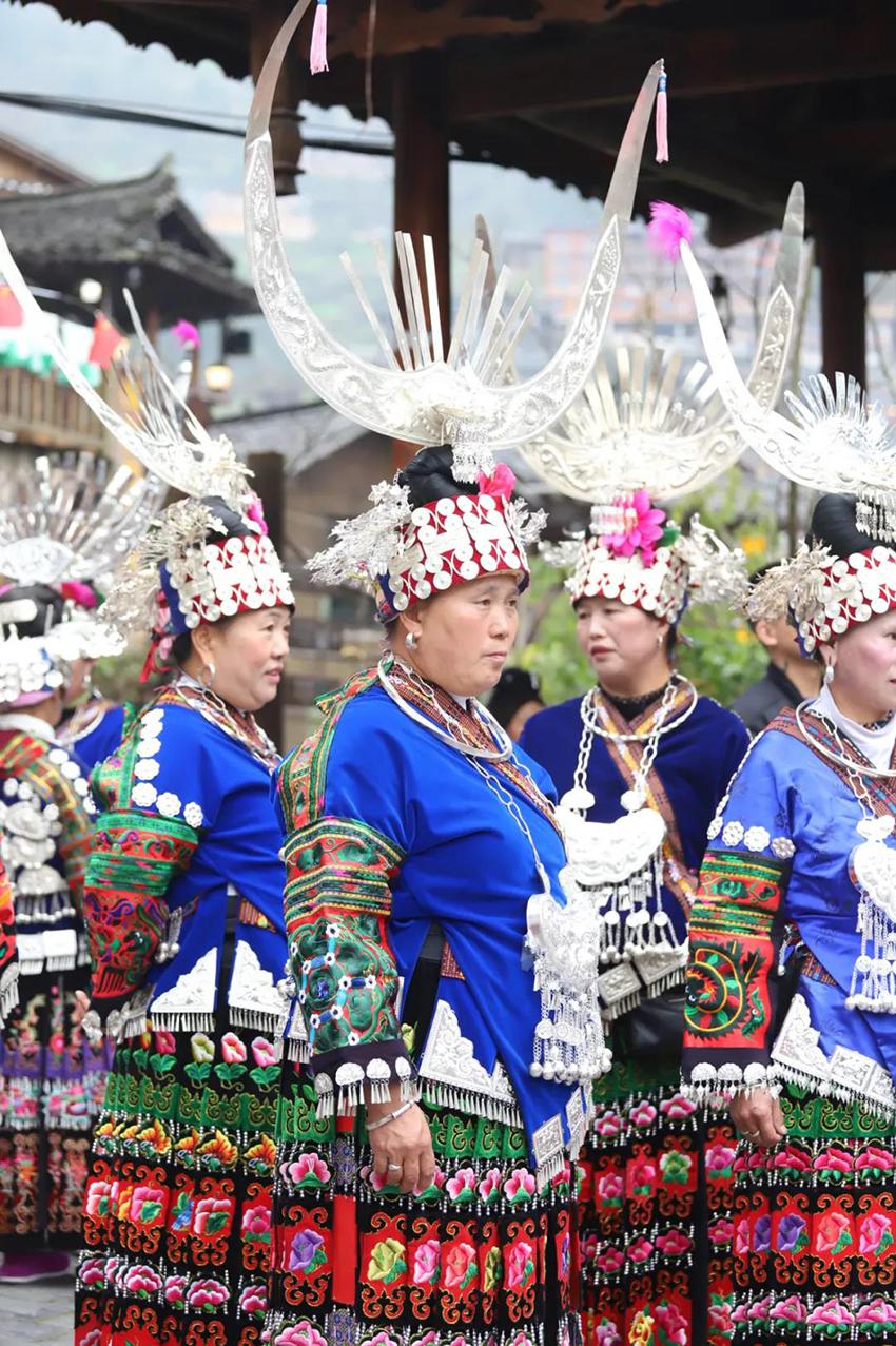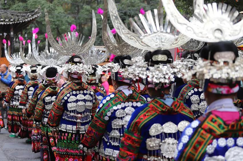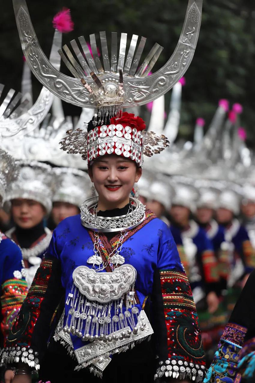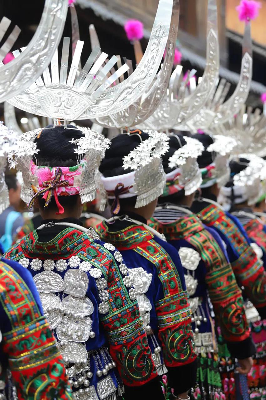 苗族银饰盛装展示大巡游,巡游队伍随着芦笙的节奏,跳起了欢快的舞姿,现场气氛热烈。苗族银饰素以用料讲究 ,构图精巧,造型典雅,色彩艳丽,淳朴自然,技艺精湛而著称。在苗族古歌中:就有“运金运银,打住撑天,铸造日月”的说法。苗族服饰被誉为“无字史书”和穿在身上的“史书”,靠世代口传身授,将流传千年的故事融进服饰文化当中,一针一线绣进衣冠服饰,世代"穿"承,永不忘怀。
