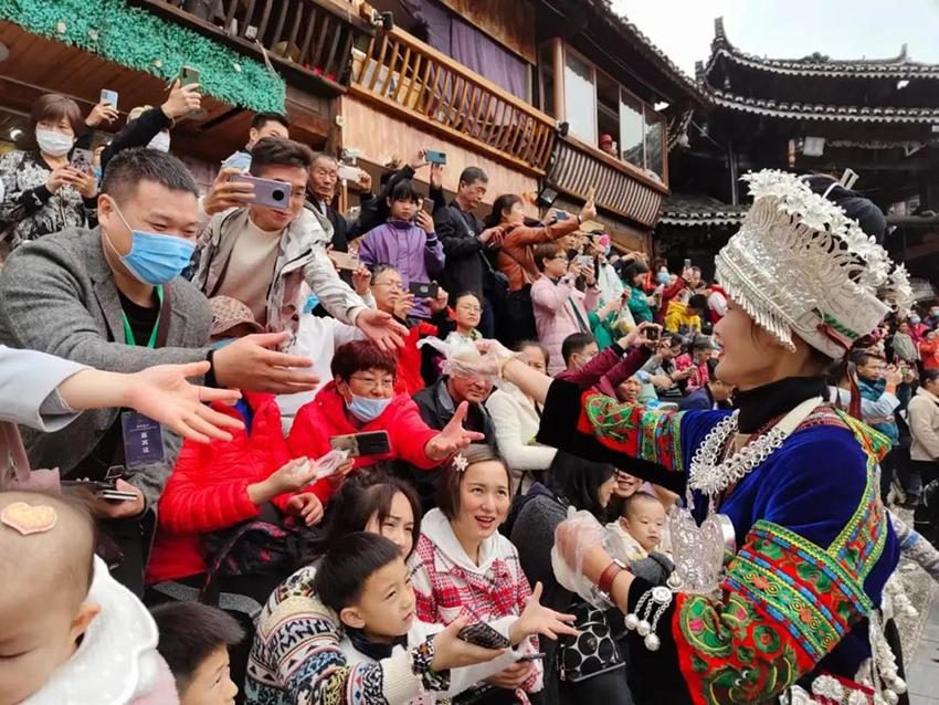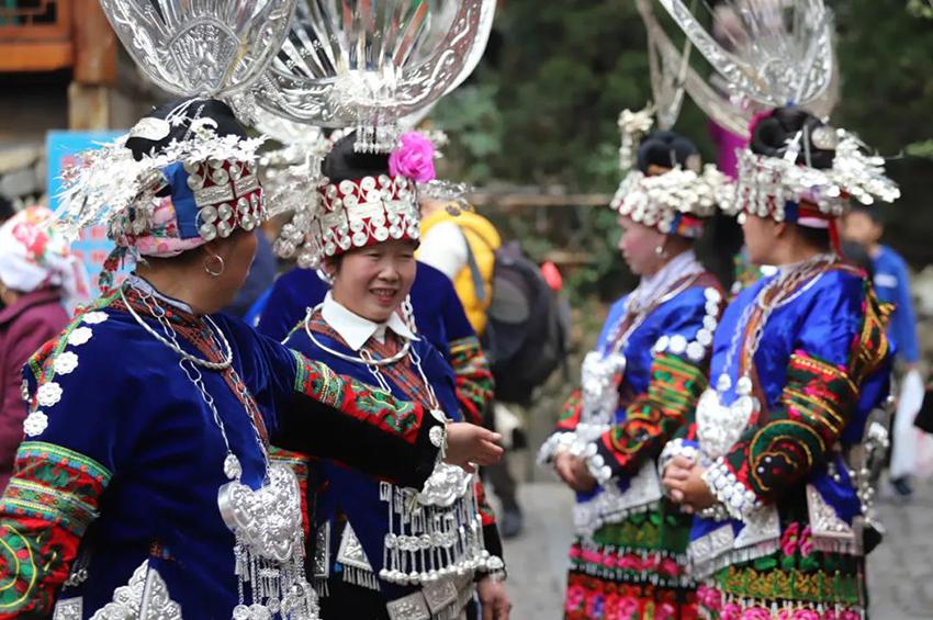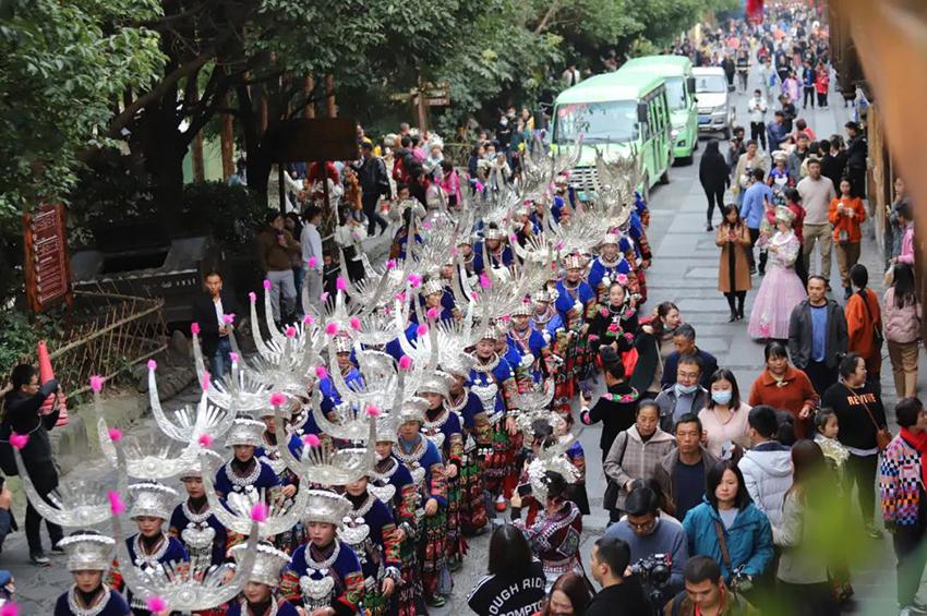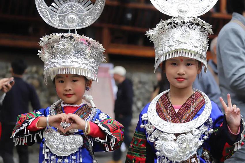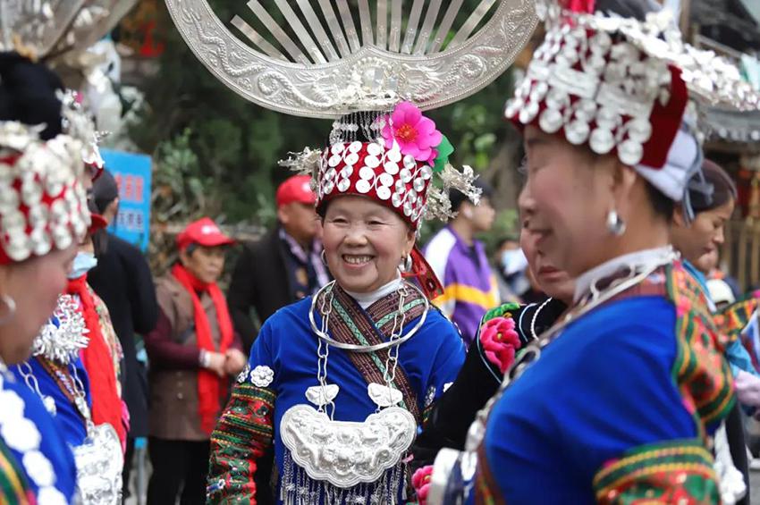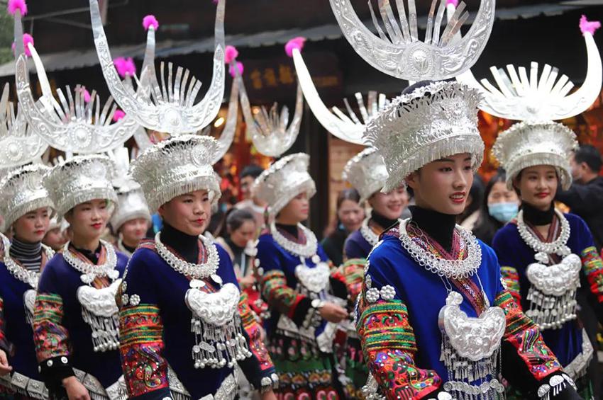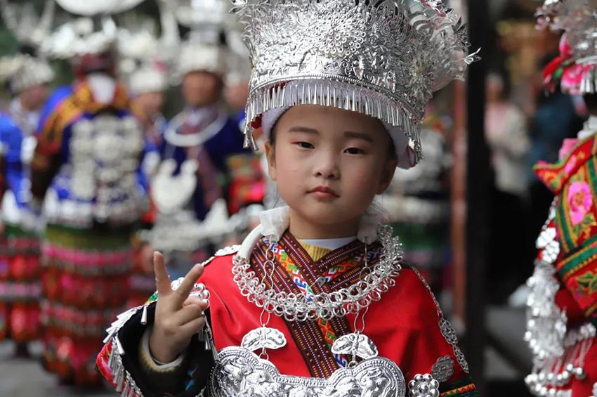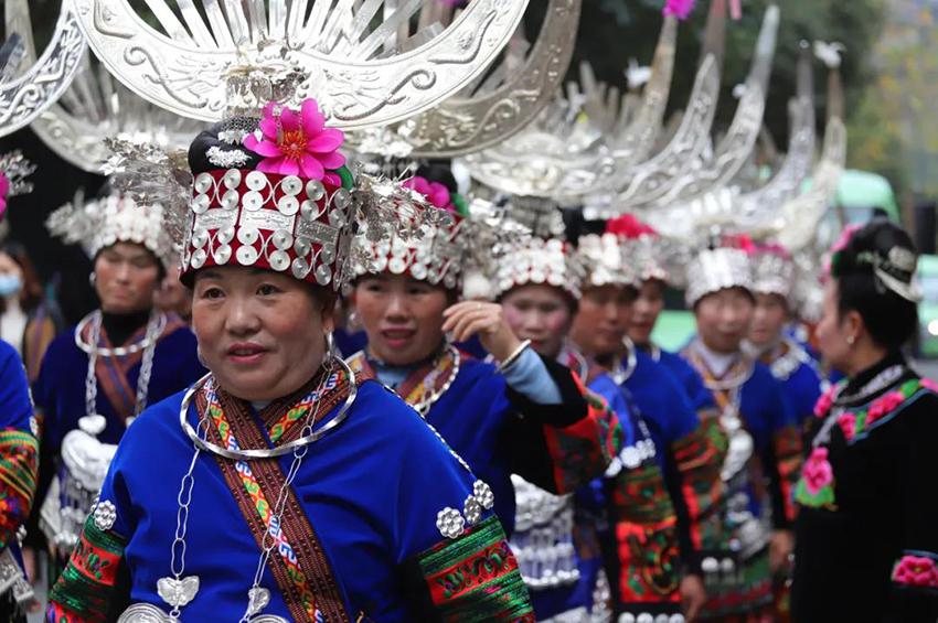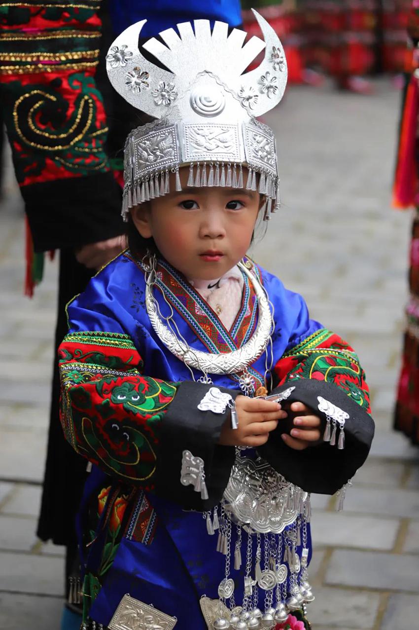 苗族银饰盛装展示大巡游,巡游队伍随着芦笙的节奏,跳起了欢快的舞姿,现场气氛热烈。苗族银饰素以用料讲究 ,构图精巧,造型典雅,色彩艳丽,淳朴自然,技艺精湛而著称。在苗族古歌中:就有“运金运银,打住撑天,铸造日月”的说法。苗族服饰被誉为“无字史书”和穿在身上的“史书”,靠世代口传身授,将流传千年的故事融进服饰文化当中,一针一线绣进衣冠服饰,世代"穿"承,永不忘怀。