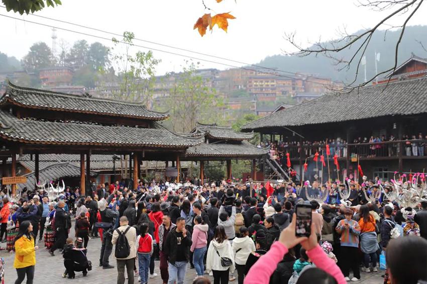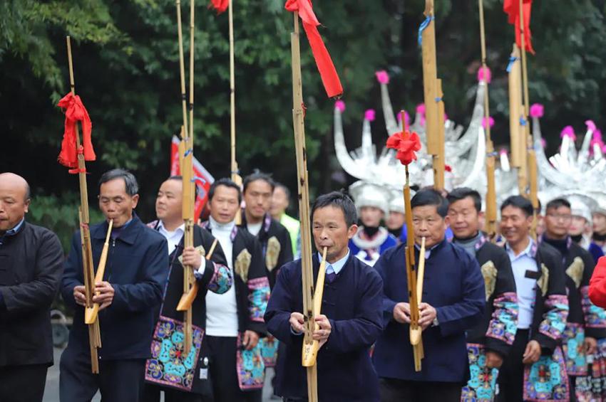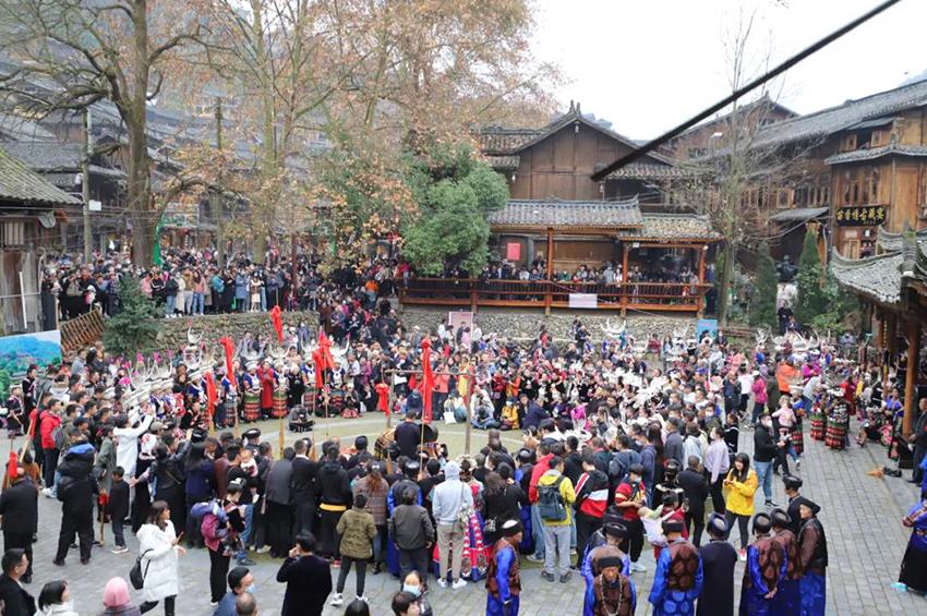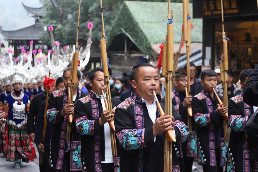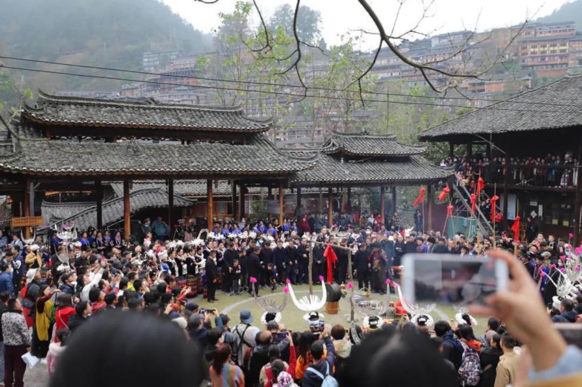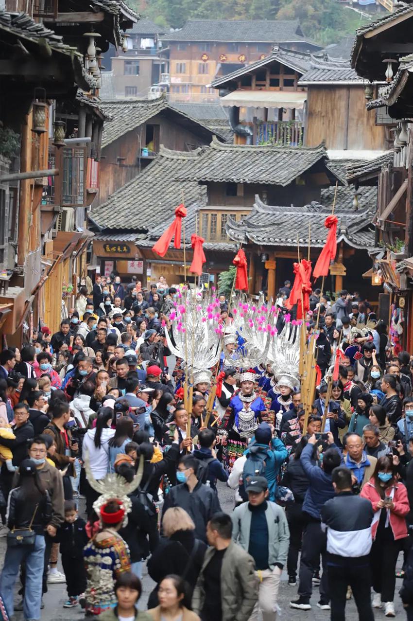西江苗年民俗活动很丰富,祭祀祖先,吹芦笙踩堂,走寨结同年,姑娘们穿鸟衣,戴银首饰,银花冠翩翩起舞,银佩脆响和笙歌,交织成节日动人的旋律。