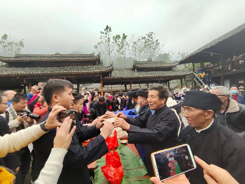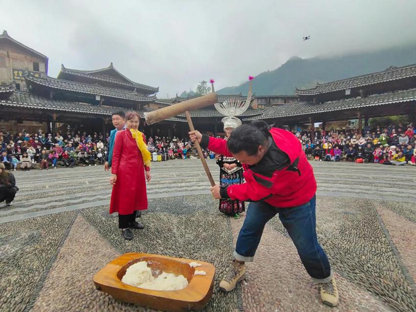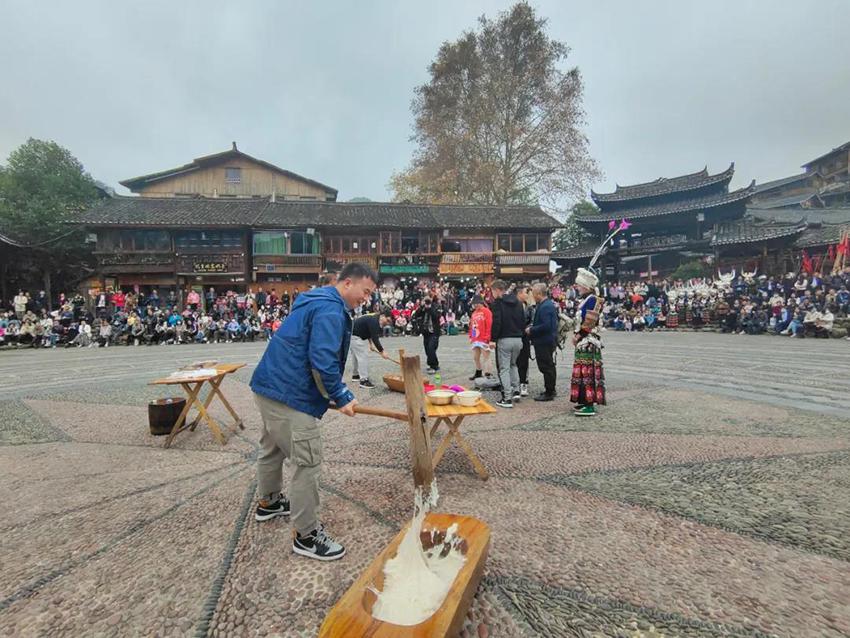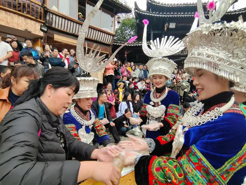 打糍粑是苗族人逢年过节的一种传统习俗,每到过节,就会听到苗寨里响起的此起彼伏快乐的“打糍粑协奏曲”,犹如节日的祝福不绝于耳。现场游客互动打糯米糍粑,看谁做的糍粑最好看,最吸引人!香甜可口的糯米糍粑,无论老少,四季皆宜,无论婚丧嫁娶,仪式庆典,都要用到糯米饭。现场游客品尝糯米糍粑,津津乐道,赞不绝口。
