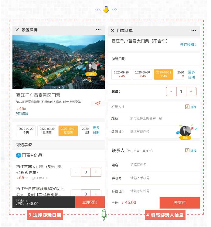 通过和西江千户苗寨景区合作OTA平台(携程、美团、去哪儿、驴妈妈、马蜂窝、同程、飞猪、)等平台提前预约