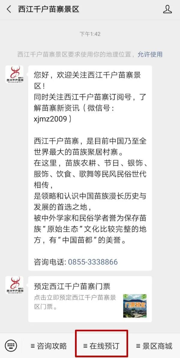 1、扫码关注“西江千户苗寨景区”微信公众账号