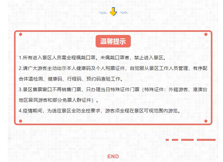 所有游客进入景区时须进行“健康码”和“行程码”扫码核验、测体温、戴口罩并出示预约成功信息方可进入景区,排队时请保持1米以上间距。
