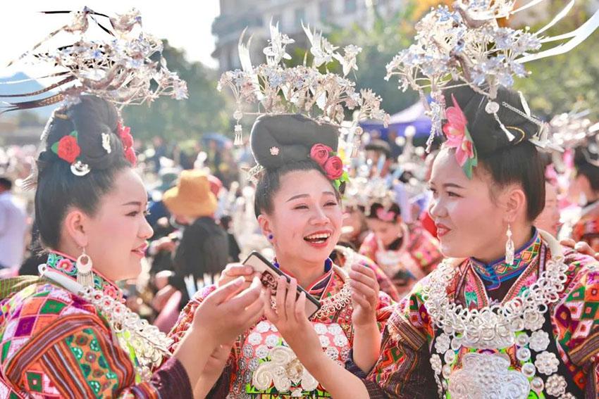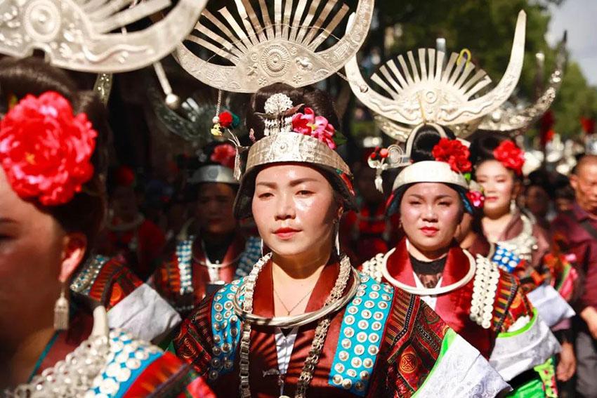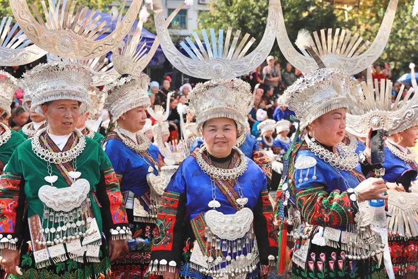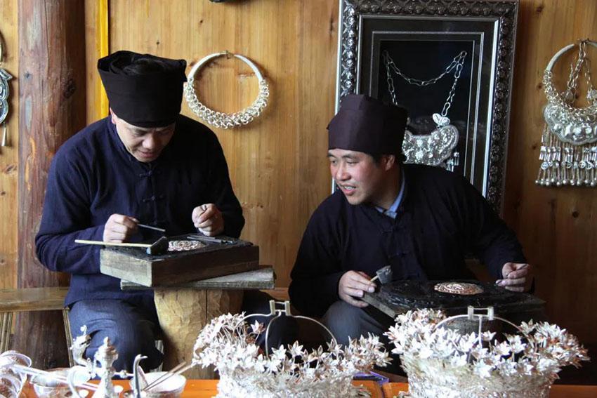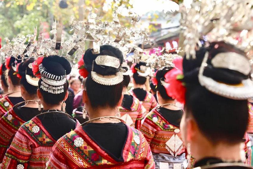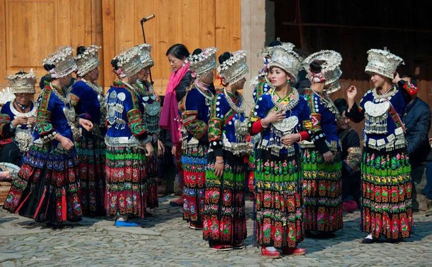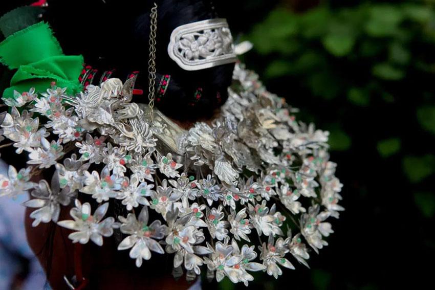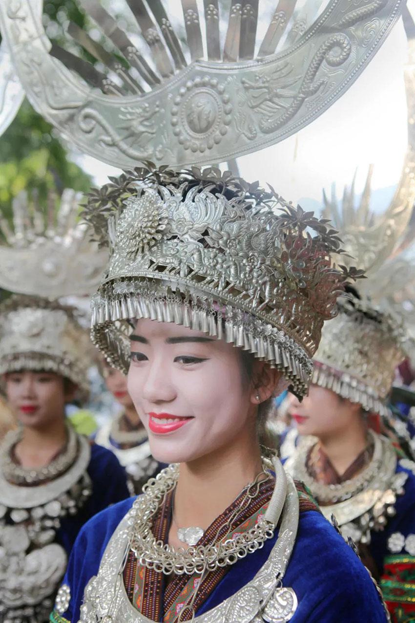 每到逢年过节或有重大活动,人们都会在西江苗寨看到身着盛装的苗族姑娘,她们穿着亮丽的苗族服饰,头戴大银翅,一身银光闪闪,绚丽动人,走起路来,银饰盛装发出唰唰唰的声响。“聚会时时精美的银河,跳舞时是壮观的银海”。