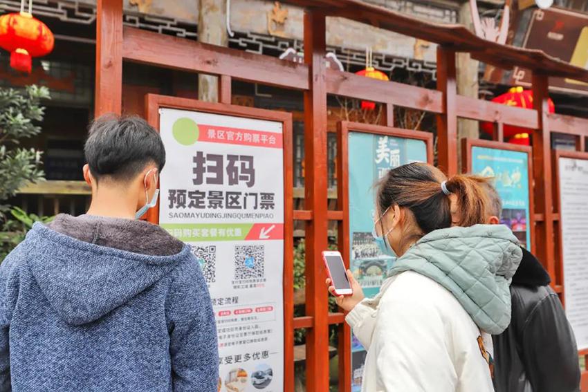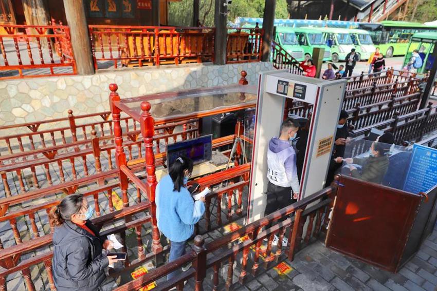 工作人员引导游客入园预约,并仔细检查游客的健康码、测量体温,有条不紊的维持着游客排队秩序,保障游客健康安全入园。