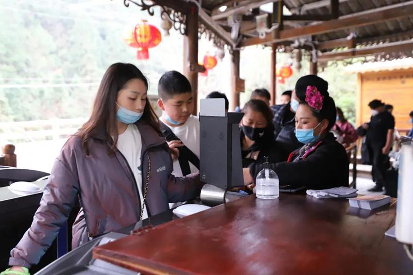 疫情期间,西江千户苗寨景区始终坚持疫情防控工作,广大游客也自觉遵守疫情防控,测量体温,佩戴口罩,有序入园。