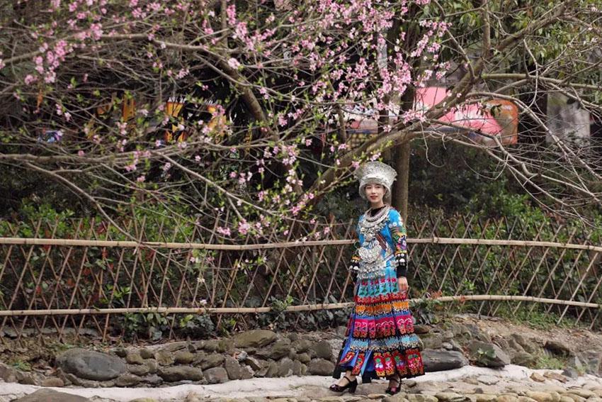 苗家阿妹轻轻吹了一口气,瞧!枝头长出了嫩芽,翠绿欲滴,桃树上缀满花儿,粉里透红。