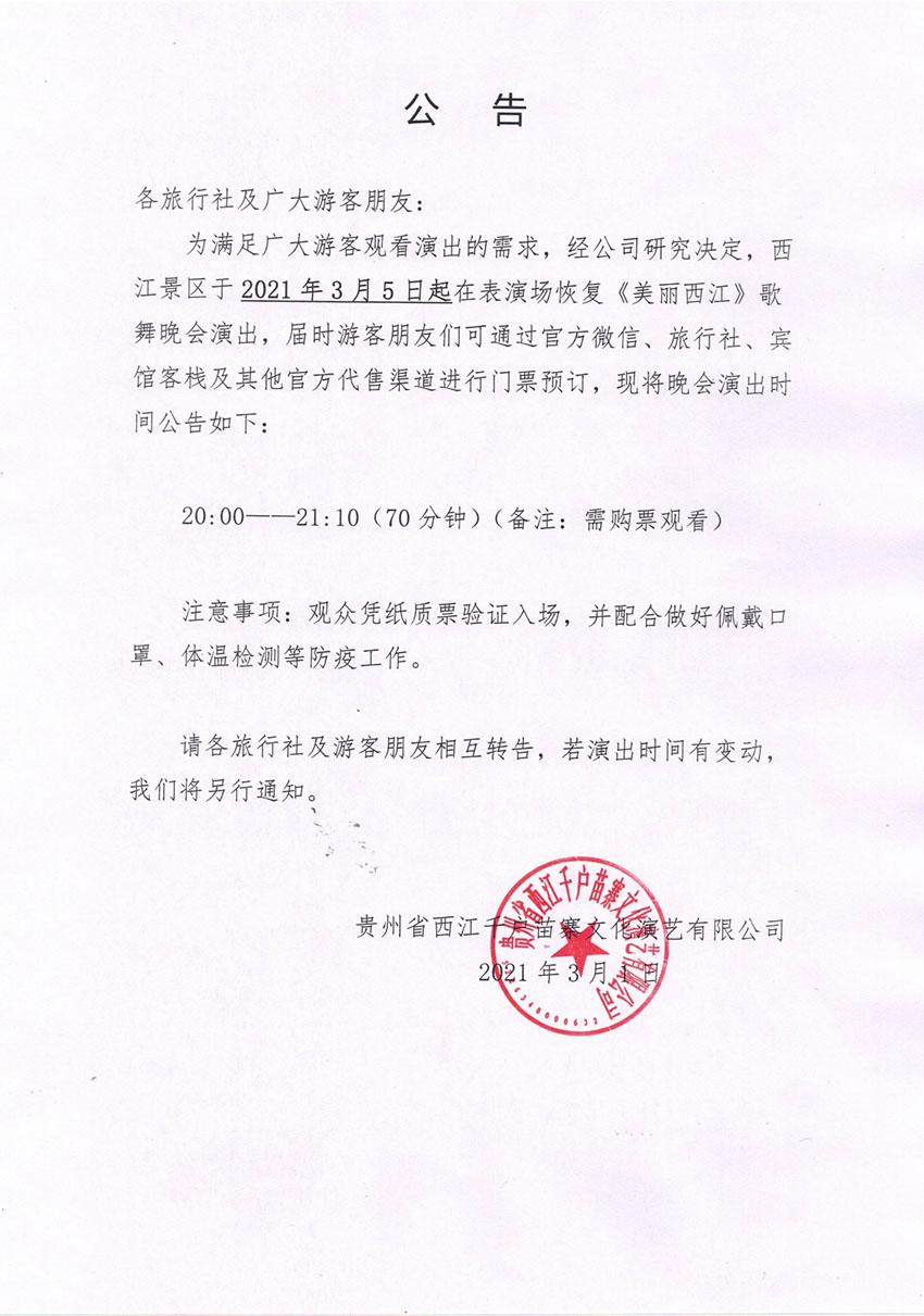 自3月5日起,大型苗族歌舞晚会《美丽西江》于晚上20:00在景区表演场盛大开演,欢迎大家前来观看!