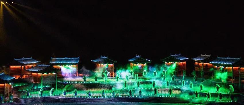 西江盛典——智慧与苗族特色元素集成,凝铸一部山河盛景之歌。到西江盛典赏不可复制的实景山水之歌。108栋吊脚楼古村落为舞台背景,以及有着600多年历史的苗族独特建筑“水上粮仓”等苗族元素为实景。