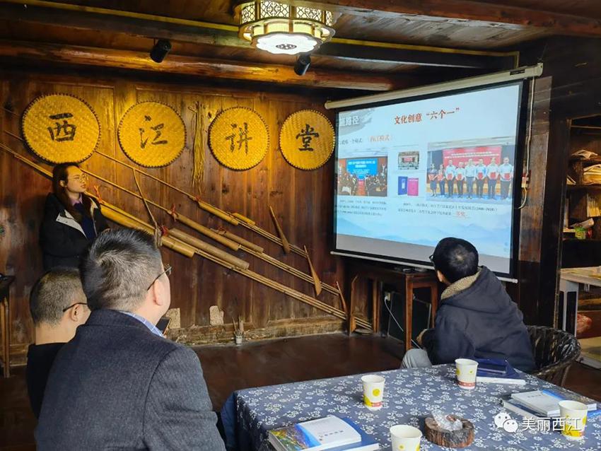 在“西江讲堂”举行的“旅游减贫与基层社会治理座谈会”上,西江千户苗寨文化研究院助理研究员周美慧向与会专家介绍了自研究院成立以来的相关研究状况。接着由贵州省民间文艺家协会主席、西江千户苗寨文化研究院院长、博士生导师李天翼教授为考察专家们介绍了自2008年以来西江旅游发展情况以及旅游减贫的效度和成就。