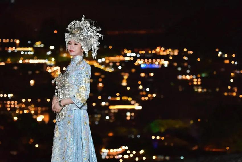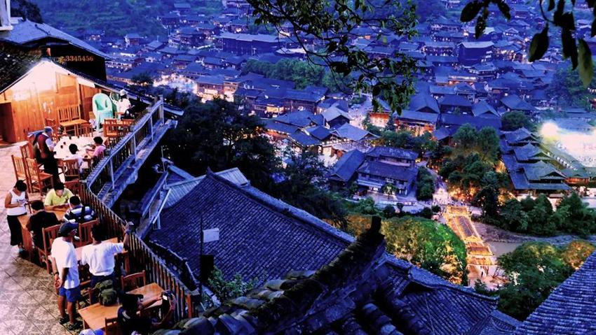 穿过气质恢弘的楼间,夜幕降临时分,登上观景台,随着歌声,看看月亮悄悄爬上山头,远眺西江苗寨万家灯火,宛如星空之城。